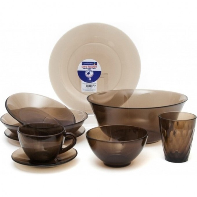 Столовые сервизы бренда Luminarc изготовлены из высококачественного ударопрочного стекла, которое устойчиво к появлению царапин, внешним повреждениям и перепадам температур. Стекло не мутнеет со временем и не выделяет вредных веществ. По сравнению с обычной посудой, оно в 2-3 раза прочнее, и при падении разбивается на крупные неострые куски. В процессе использования стекло не тускнеет и не впитывает запахи Можно мыть в посудомоечной машине и использовать в СВЧ-печи.